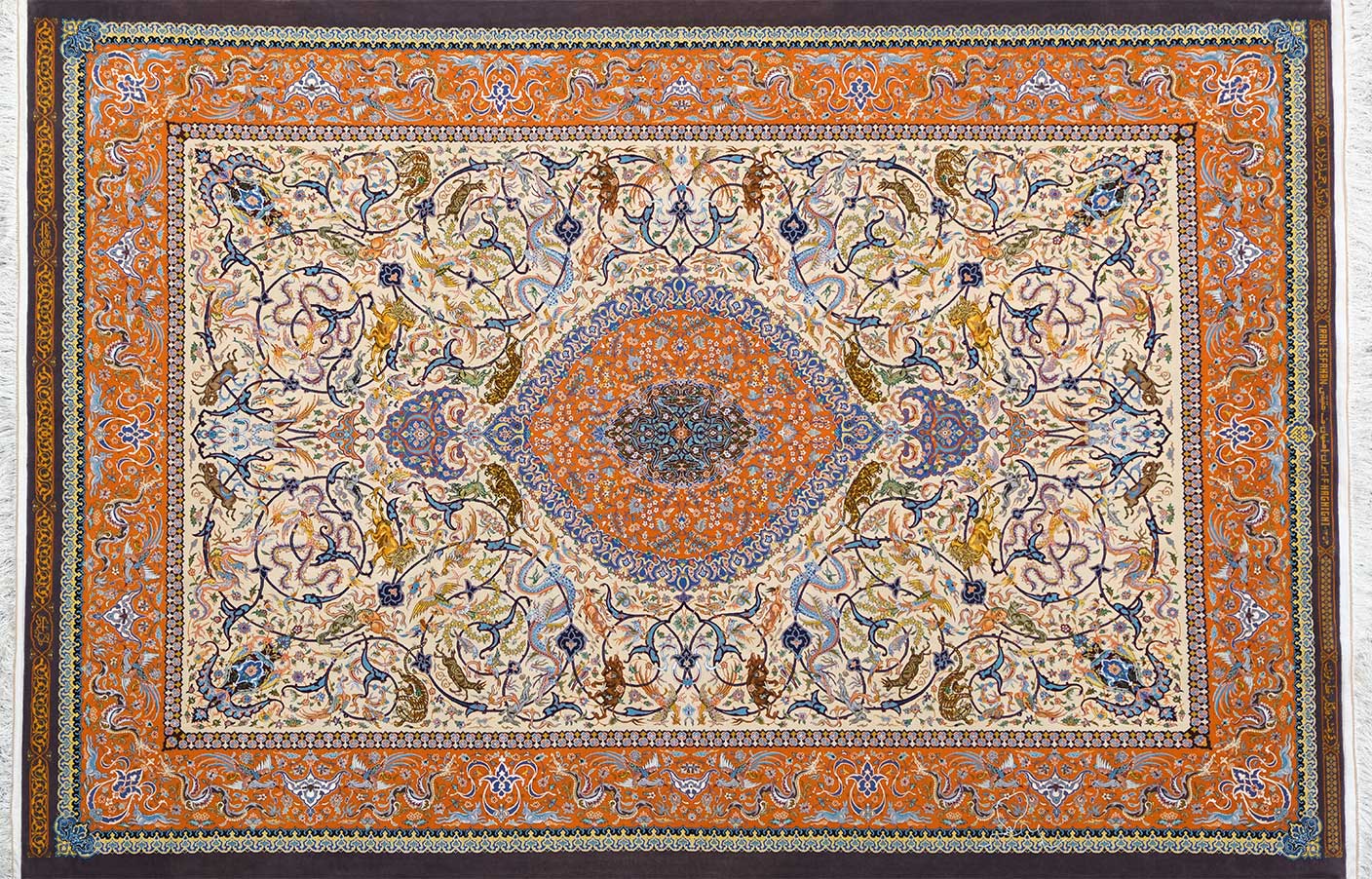 Originally designed by the great Issa Bahadori, this piece takes its name from the bold orange tones woven into it. A larger version of the same design, woven by Master Gholamali Khan Safdarzadeh Haghighi, is housed in the Iran Carpet Museum.